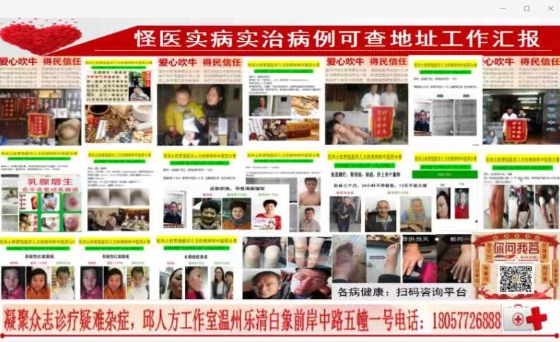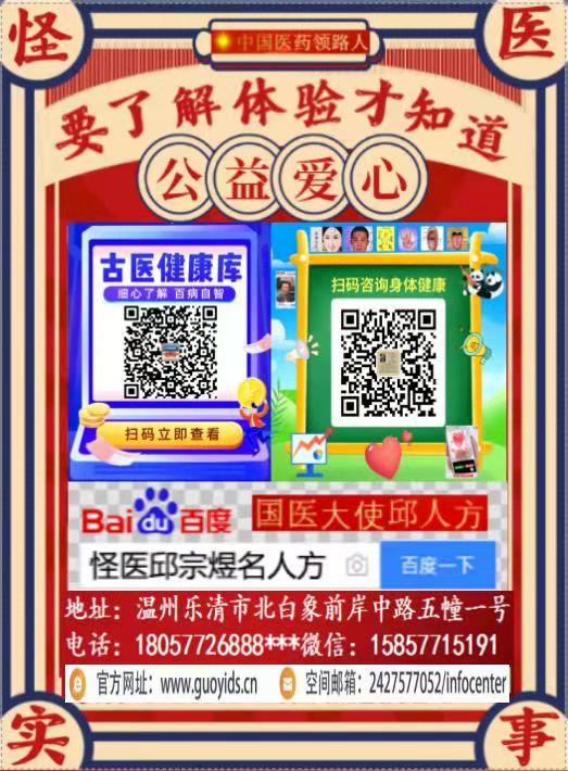 第六怪:“不打针吃药治头胫部肿瘤”,如,欧北镇龙桥街母带女儿来问诊说:自己带女到欧北中医院捡查医生查定是肿瘤,问有没办法治疗。邱老先生一看,这病是气、急、思、而得病,气伤肝,急伤心,思伤肺,你这女儿皮脾气气太不好。母亲接着说先生给你看得太准了,女儿开车总是想把别人车占据在前开,我老了做饭给她吃这样那样骂不会做,房间地总不打扫,脾气皮气是不好。后来我问她女儿你想治好吗?当然想啊!你医生的话用心去做保证治好。医生我保证听你的,好,要做到态度和气不要和他人争高低,要做到你母亲这样年龄做饭理家务事应该有你做才能压力下降,不能思路扰乱伤心肺学会开心,如果做到不打针吃药病自然会愈。回去以后过了半月后妈妈来告诉说:太感谢你把我女儿病治好了。从回去常对女儿说听医生话说来有道理,后来女儿脾气皮气大改大家开心,昨天带女捡查医生说已小了一半,医生说这样病给中医药治疗,再高明医生治疗再说三至六个月,半月好得这怎么快是那里治疗,是邱老先生治的,不打針针吃药心理治疗,医生的结论说真是怪医。