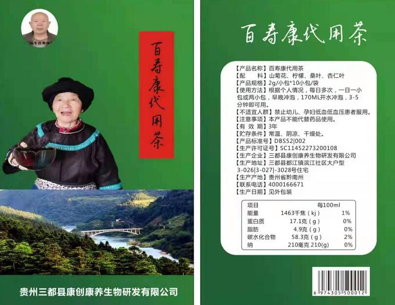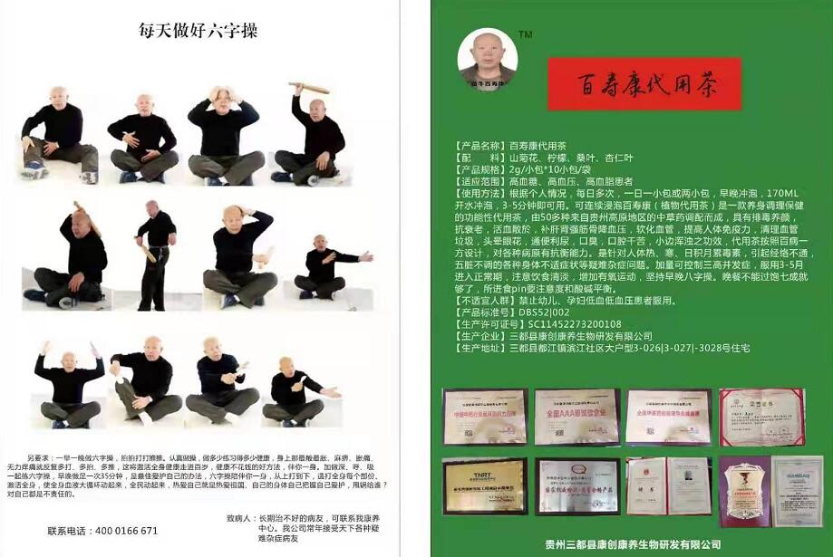 贵州三都县康创康养生物研发公司,内设有康养中心,食品保健品加工厂,生产的百寿康茶汤,一号、二号、三号、四号系列产品产品,1号茶汤:能解决人三高前期和即将爆发的并发症。2号茶汤:1号加2号可治早中期尿毒症、脑血栓、癌症系列。3号茶汤加进1、2、3号茶汤就可治愈艾滋病、各种病症。各位老人再加上我部的棒棒操、拍拍打打操,每天人们只要早晚练上一小时,再喝上百寿康茶汤,活上100岁没问题。这是38年来黄力力自己研发的一整套健康方法,让中华民族从此从亚健康走向健康。