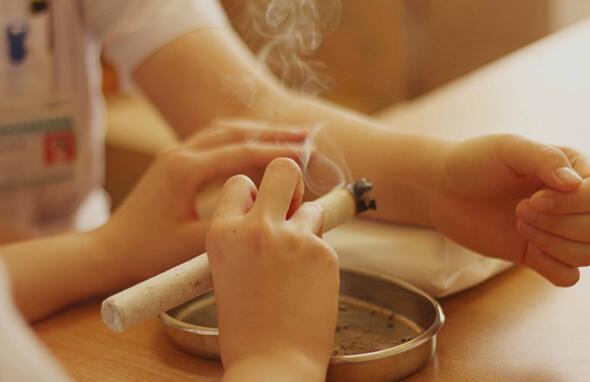 (3)、雀啄灸,艾条燃着的一端对准穴位,上下移动,鸟雀啄米样施灸,一般可灸5分钟左右。多用于灸治急性病、昏厥急救、儿童疾患等;此法热力较强,注意避免烫伤皮肤。