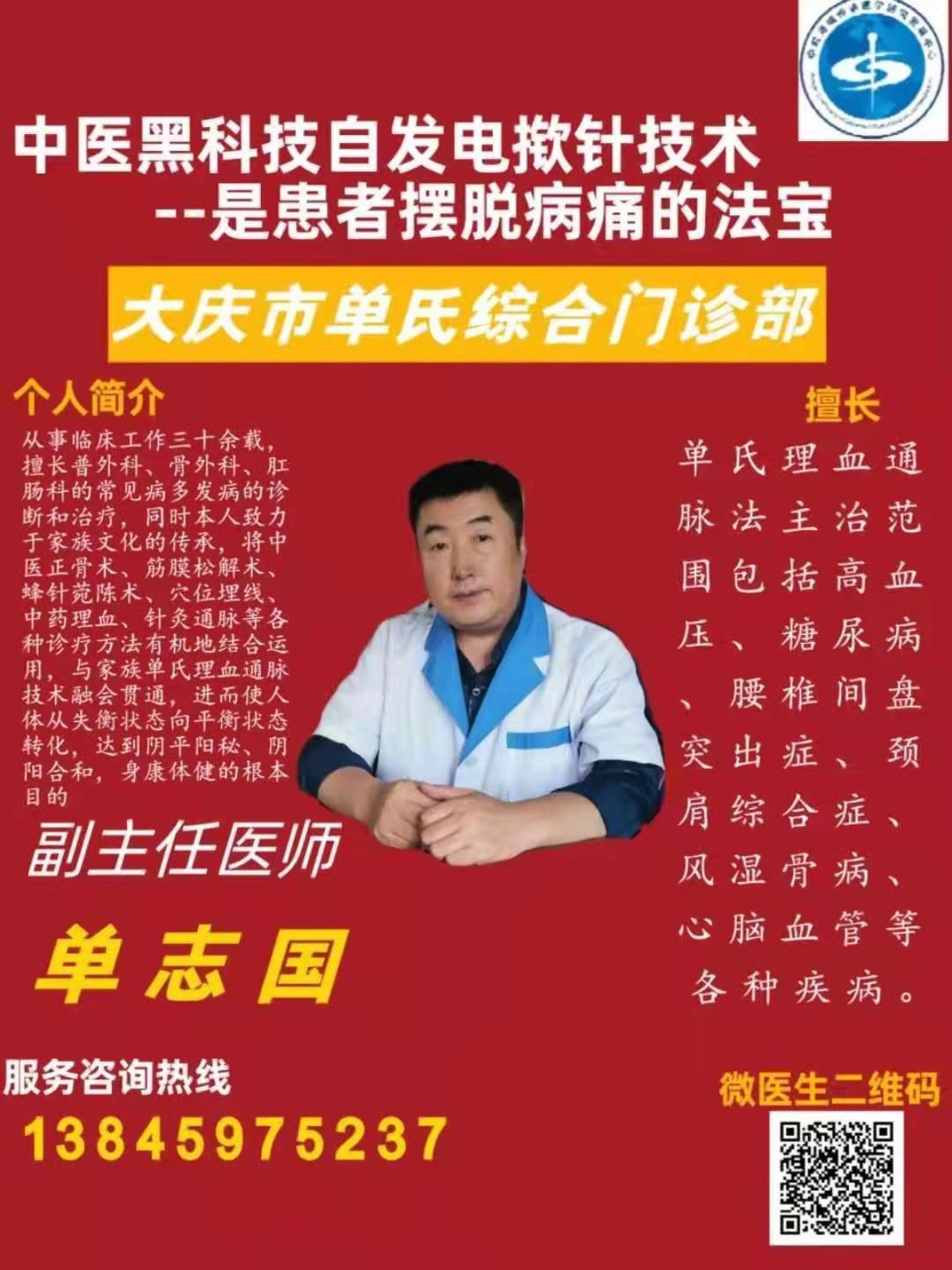 单氏蜂针(创针靶向治疗技术)创始人全科副主任医师单志国,从事临床工作三十余载,致力于家族中医文化的传承,将中医正骨术、筋膜松解术、中药理血、针灸通脉等各种诊疗方法有机地结合运用,与家族单氏理血通脉技术融会贯通,创建了单氏蜂针术,一可校正小关节功能紊乱;二可剥离筋膜粘连;三可排除病灶淤堵,解除压迫症状,进而改善微循环障碍,预防血栓形成。