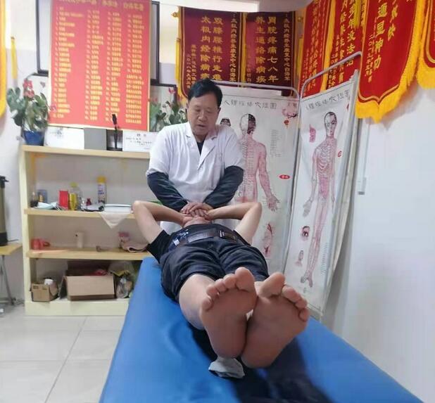 4:按压腹部,用外力加压,配合患者内气,医患合一,使体内压力增强,达到全身增强内压通到毛孔得运。