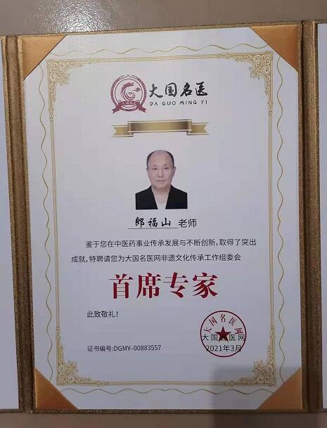 2021年3月被大国名医网非遗文化传程工作组委会特聘首席专家。