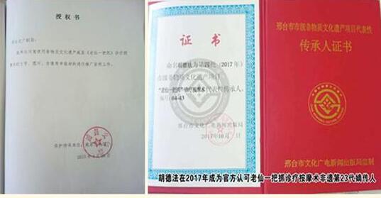 "胡氏点法"以家传“老仙一把抓诊疗按摩术"为基本,能不用药的,尽量不用药,能不用针的尽量不动针,用手法治大病。医术独特,功效显著,对患者因病施术,因人而异,治病过程痛苦少,疼痛轻,甚至无感觉就能好病。古人称颂为“老仙一把抓"。“老仙一把抓”医术传承600多年,其医术达至现代医学尖端领域,经方、验方,特技独术,皆口传心授,代代传承,如同20多位专家接力,嫡传至今,可谓是一个精英团队,突破世界医学难题。如下,以治妇女月子后遗症而著名,对妇科、骨科、男科、儿科以及疑难杂症为一体,享誉周边省市。