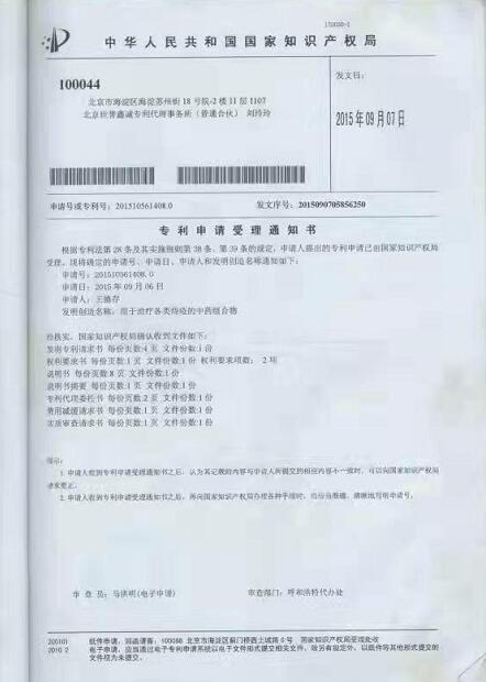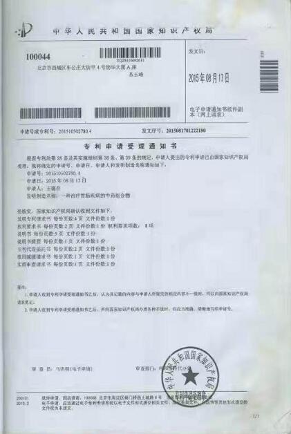 2015年他有两项专利先后被国家知识产权局受理:分别是“一种治疗胃肠疾病的中药组合物”,专利受理号为:2015105027804;另有“用于治疗各类痔疮的中药组合物”,专利受理号为:2015105614080。现对外转让。