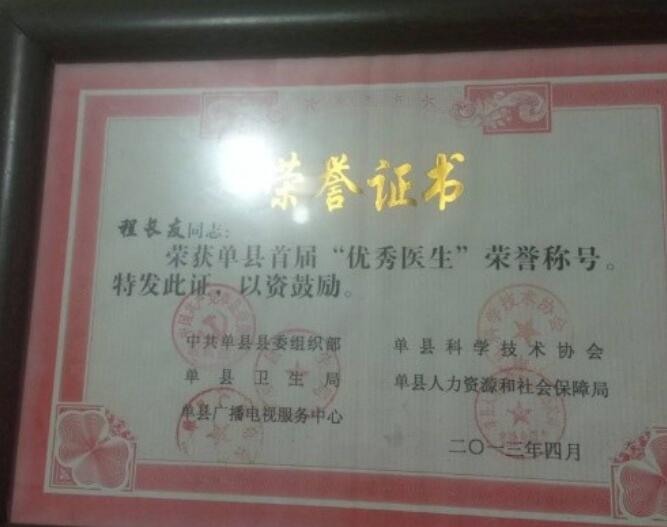 2013年4月被单县组织部、卫生局、广电局、人力资源和社会保障局及单县科协五部门评为优秀医生 。
