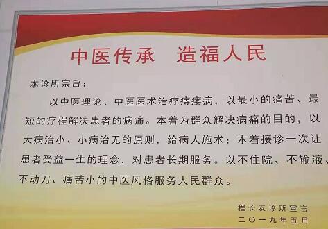 1990年,他把更多的时间投入到肛肠病研究和治疗上,他认为中医所说的通则不痛,痛则不通,是很有道理的,人体经络是连接人体五脏六腑的桥梁,承担着运气化血,运输肌体活动所需的气血能量的重任,是脏腑得以营养,筋骨得以濡润,关节得以活动重要组织,因此它的作用是不能小看的,医生所做的不过是对身体部位的修缮,真正起决定作用的还是人体的自我修复,因为人体在长期净化过程中形成一种高度完善的智能系统,基于这种认识,程大夫诊治病人,重视中药对人体经络的调理,从而达到治愈病变的目的。 程长友吸取中华医术之精粹,结合西医先进治疗技术,根据多年的实践,结合自己的临床经验,运用无痛疗法,治愈治瘘病方法,潜心为山东地区患者诊断治疗,解除患者病痛。