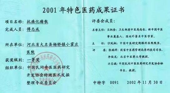 傅志成,河北大名人,北京中医研究院大名分院大街卫生所主治大夫,特色治癌名医,食道癌早诊早治研究基地主任,汤药“延寿活命饮”、中药提取物“抗癌生化植物粉”发明人。
