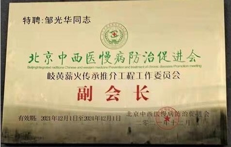 传承是中医药的生命之根,是其发展的基础和动力!为培养一批真正懂中医,识中药,能临床治病的中医药人才,把传承的工作延续承担起来,迎来改天换地复兴的新容貌!如今邹光华老师把毕生所学毫无保留地传授给众多的弟子,使其发扬光大,结业后发传承证书,可一生为徒,成就你的名师意愿。邹光华老师现面向社会收徒传艺。要学技就要跟名师学习,学一个特色可以造福一方百姓,让天下医友多一个健康的选择。 2021年12月参加北京中西医慢病防治促进会——歧黄薪火传承推介工程工作委员会任副会长 2007年10月应国家卫生部邀请参加过韩国中医考察