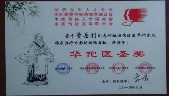 董岳利先生,祖上历代行医,世代相传古老医术,在当今中医脉学理论界,仍存在着董氏脉理。所有家族内学医之人皆自幼学起,以中医汤头歌诀及中药名称作为启蒙教育,培养对中医、中药的兴趣和喜爱,对各种中药材的加工泡制方法和传统剂型丸、散、膏、丹的加工制作过程精通。随父开始学习中医脉学理论以及针灸学、伤寒论、骨伤学和董氏骨科整形技术,他继承且精通天地、阴阳五行、术数等在内的易经。曾多次被世界医学领袖宋一同主席接见。