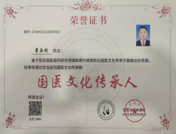 董岳利医生深得父亲口传身教精髓,遍访民间名医,纳百家之长补已之不足。父亲生前将毕生研究的各种中药材提取方法及处方、药方、秘方传予董岳利,使其在今后的中医药处方研究中,更加得心应手,这些学习的过程和经历,为发扬中华瑰宝中医药古方今用的研究,积累了丰富的知识和经验,奠定了坚实的基础。