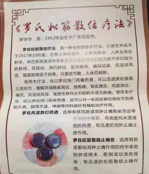 《罗氏松筋散结疗法》,是一种集多种徒手疗法之大成,取众多徒手疗法之精华,弃众多疗法之不足,揉合而成的一种全新的徒手疗法。它孕育于 2011年,诞生并成书于2017年10月底。诞生之日起便传播于笔者的微信群与QQ群,得到群友的一致认同。2017年前只有笔者在运用。2018年本市有合作伙伴运用将它传播于本省及周边省市的亲友,传播到美国越南、加拿大、巴拿马、委瑞内拉等十多个国家的华侨群体。《罗氏松筋散结疗法》作为特邀嘉宾参加第一届葛洪杯中医适宜技术交流大会,并参加粤港澳大湾区国际中医药自然疗法论坛暨慢病防治适宜技术交流推广大会。目前除西藏、内蒙古外,基本都人常用此疗法。