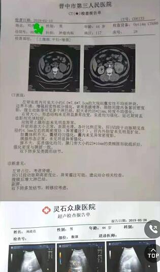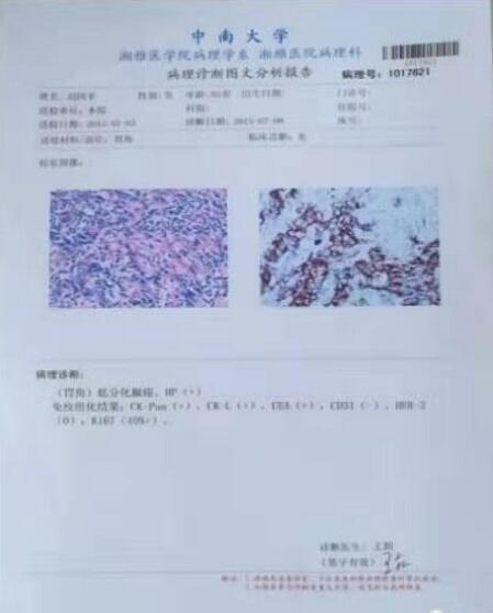 低分化胃腺癌,本人岳父。于2015年7月5号在湖南省湘雅附一检查出胃癌肝转移。病理诊断:低分化胃腺癌。HP(+)免疫组化结果:CK-Pan(+),CK-L(+),CEA(+),CD31(-),HER-2(0),Ki67(40%).CT检查提示:1.慢性支气管管疾患,肺气肿,支气管扩张,左肺上叶舌段、右肺中叶、右肺下叶后基底段感染。2.右下侧胸膜增厚钙化。3.右肾小结石。患者刘国孝(周崇立岳父)治疗前的检查结果,外敷抗癌贴一天一次,外敷胃俞穴5-10小时。抗癌延寿灵直接直肠给药早晚一次75毫升。脐疗灸一次2克、艾灸20分钟-2个小时,艾灸后外敷12小时,一天一次,合理治疗。2019 年10月恢复比较理想,并且还种2亩田地,养了塘鱼。因此打破了得了癌症不用死亡,只要采取正确的方法治疗,它只是慢性病一种。