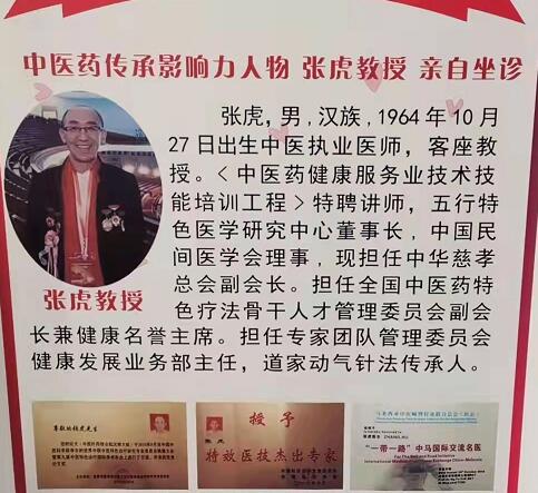 张虎,山西省朔州人,副主任医师,客座教授,中医药健康服务业技术技能培训工程特聘讲师,五行特色医学研究中心董事长,中国民间医药学会理事,中华慈孝总会副会长,全国中医药特色疗法骨干人才管理委员会代理会长兼健康名誉主席,专家团队管理委员会健康发展业务部主任,道家动气针法传承人。