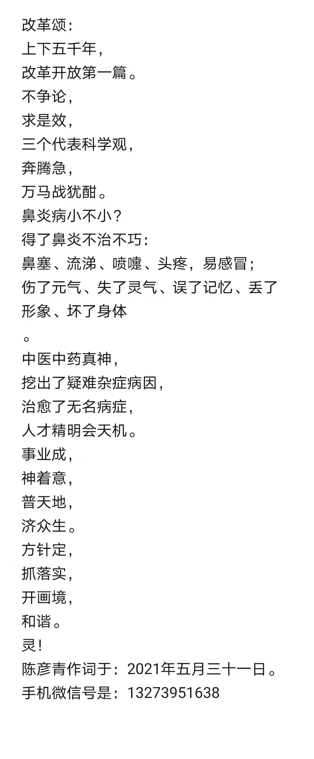 陈彦青大夫是中医鼻炎专科的先行者。其手机微信号是:13603857859。他研发的鼻炎克星技术申报了国家知识产权局的发明专利技术,受理号为:00118223.4。该技术具有很好的:实用性、新颖性和可推广性。对鼻炎、鼻窦炎、和过敏性鼻炎采用不吃药、不打针、不手术的办法,鼻腔给药就好啦!且无痛苦、花钱少、无毒副作用。立竿见影疗效好。