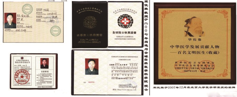 宋优胜老师于2007年晋升为世界中西医结合医学科学研究院传统医学教授并增选为全球自然医学科学院院士。已经荣载由国家卫生部中医药管理局、全国二十九个省市卫生厅领导组成的编审团,审批编辑出版的《2008年中国中医药年鉴(行政卷)》。