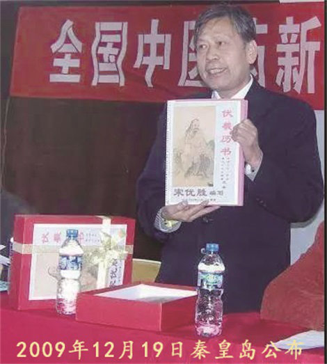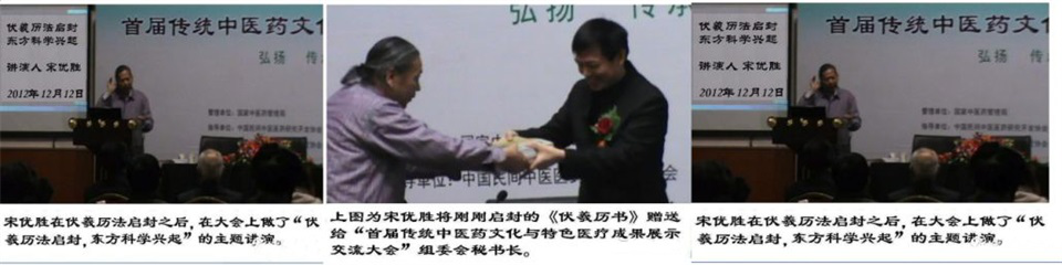 在玛雅历法终结前九天即2012年12月12日,在北京西站瑞海大酒店举办的“首届传统中医药文化与特色医疗成果展示交流大会”开幕式上宋优胜教授启封了尘封已久的伏羲历法,供全球华人祛病养生使用,并将启封的三套当年使用的伏曆9787岁养生日历——《伏羲历书》赠送给大会。本次大会上宋优胜做了“伏羲历法启封东方科学兴起”的专题讲演。