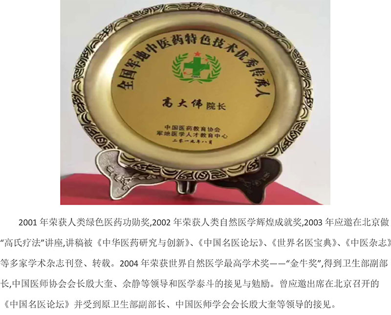 2001年荣获人类绿色医药功勋奖,2002年荣获人类自然医学辉煌成就奖,2003年应邀在北京人民大会堂做“高氏疗法”讲座,讲稿被《中华医药研究与创新》、《中国名医论坛》、《世界名医宝典》、《中医杂志》等多家学术杂志刊登、转载。2004年荣获世界自然医学高学术奖——“金牛奖”。