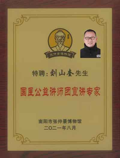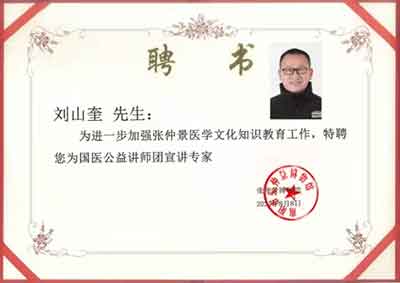 4、刘山奎老师始终秉承着人命至重,有贵千金,一方济之,德逾于此的信念服务于大众。刘山奎老师热爱传统的中医学,从事中医工作,爱岗敬业,能够为病患着想,热情待人,团结同志,希望祖辈传下的中医医术在这里能发扬光大,造福人类,让更多的人解除病痛.谋事在人,成事在天,顺应天道通终成。医者仁心,历史会记的刘山奎老师为百姓的幸福和中医药事业传承所做出的贡献。医德如碑,责任如山!他的济世情怀诠释着奉献价值的真谛。愿他用仁爱铸就的事业造福更多的人!
