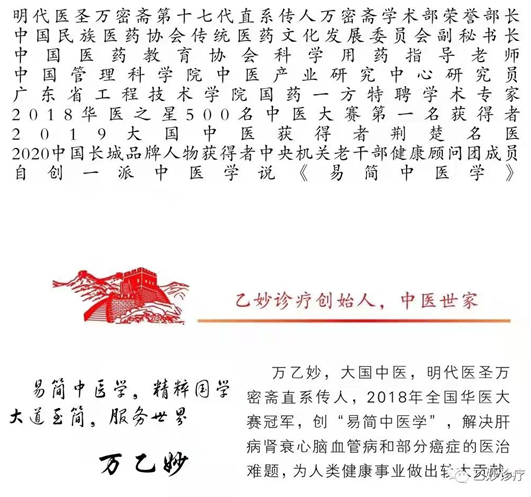注:2018年全国中医华医之星大赛,万乙妙先生夺得冠军。万乙妙先生乃明代医圣万密斋十七代直系传人。万乙妙先生三岁时在祖父督促下开始背诵《伤寒杂病论》,七岁待诊,十五岁能独立处方。万乙妙先生对疑难杂症医治亦有独特建树。其具体实际报道可见国医网,即中国国医信息门户网站。