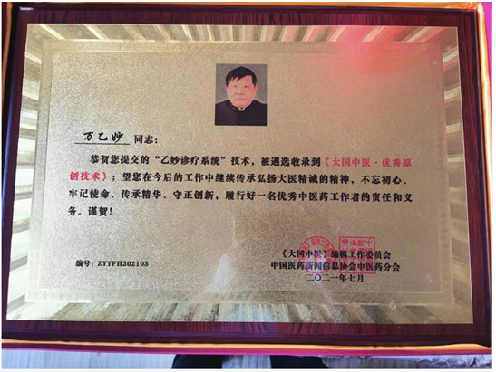 九九年工作压力大,患上了偏头痛,三次住院治疗,中西药,针灸推拿外敷都试过了,无效,反复治疗近一年,遂求治于先生,万乙妙主任查脉观舌后说:“小病,好治,试试我们的干支针灸吧!应该能除根”,随即给我左手天干穴头点一针,右腿地支穴头点一针,下针后大约三十秒钟,头痛若失,15分钟左右头痛消失,留针37分钟,每天一次,连针七天,结帐时,开了一疗程易机汤方“易疗茶”,巩固疗效,至今二十年未犯,可以说除根了。二0一五年肝区不适,查出酒精肝、肝硬化也是先生用乙妙诊疗的“润肝片”“肾元能康片”治好的。我朋友的妹妹,中医药博士后主任医师,自己患隐疾多年,中西医药试遍了,欠良效,求治于先生,先生处方,三剂显效,二十一剂除根,在一次聚会时,对我们感叹:“体验了万乙妙老师的医术,觉得我十几年的医书白读了…”,后经先生点拨,从《道德经》《汤液经》《辅行决》入手,重学中医,现在成了某市著名专家。