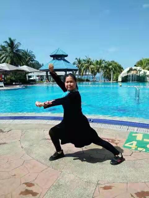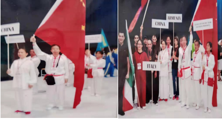 二零一六年参加参加国际功夫联合会在俄罗斯举办的武术比赛中,高举中国的标志Chⅰna!