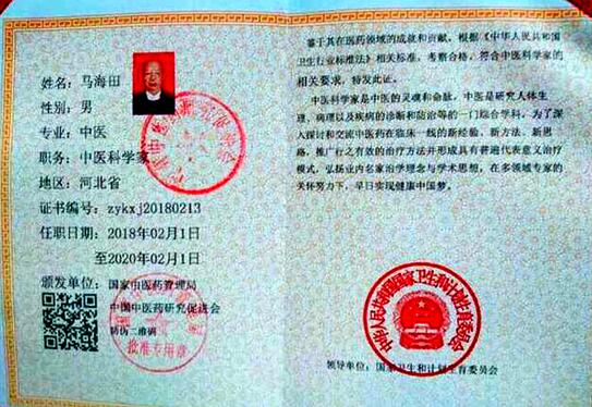 4、马海田在2012年被授予国际注册中医特色诊疗师资格。