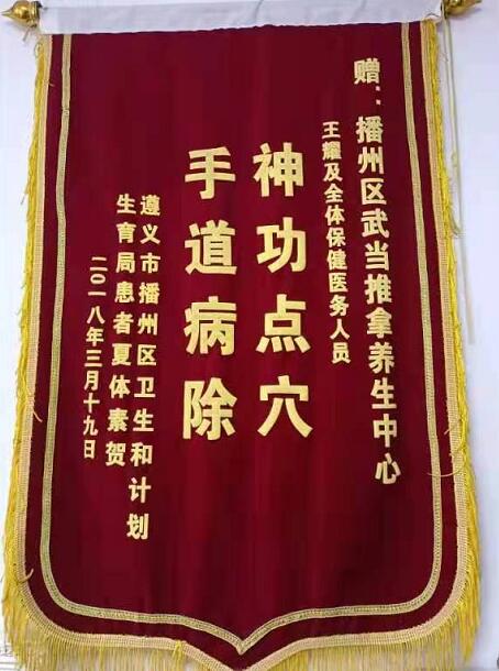 2、夏体素,女,56岁,住:贵州省遵义市播州区南白镇,电话:13511851873。主诉:患下颌关节紊乱综合征,现病史:患下颌关节紊乱综合征,在世界上都是难症,头、面部神经疼痛难忍,牙关紧锁,吃粉条都要一根一根的才能塞进嘴里,后疼痛到进食困难,经过多家医院医治无效。后经朋友介绍,特去该中心请青山老师用“青山电气通疗法”点穴理疗,经20多分钟的调理后当场见效,疼痛减轻一半,嘴可以张合,经两个疗程(20天)痊愈。另外,我的面部黑色斑顺带一起调理,二个疗程后,黑色斑全部消失,感激之情,已送锦旗感谢!至今下颌关节紊乱综合征已痊愈未发,面色洁白光亮,精神饱满。