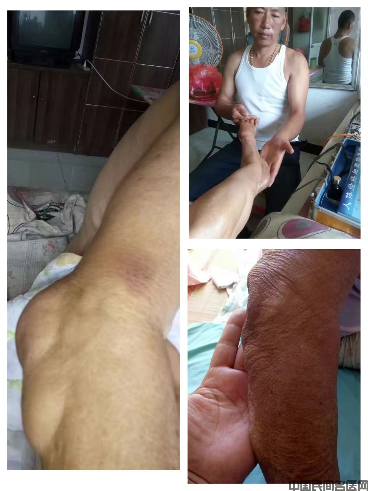症状:因不小心跌倒,造成网球肘积水!中医称之为痹症!曾去多家医院医治无效,通过她女儿介绍去当地实施调理四次!因本人要去保定学习匆匆离开!下去半个月追访以痊愈!