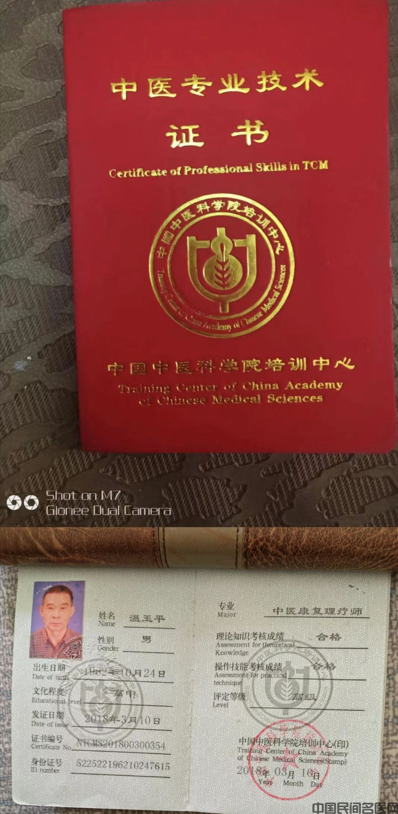 工作及学习简历:八岁开始跟着祖辈上山踩药,炮制,十五岁跟着祖辈接骨,手法腹位,夹板固定,中药配方,调制等。十八岁单独接诊。至今也有40来年。