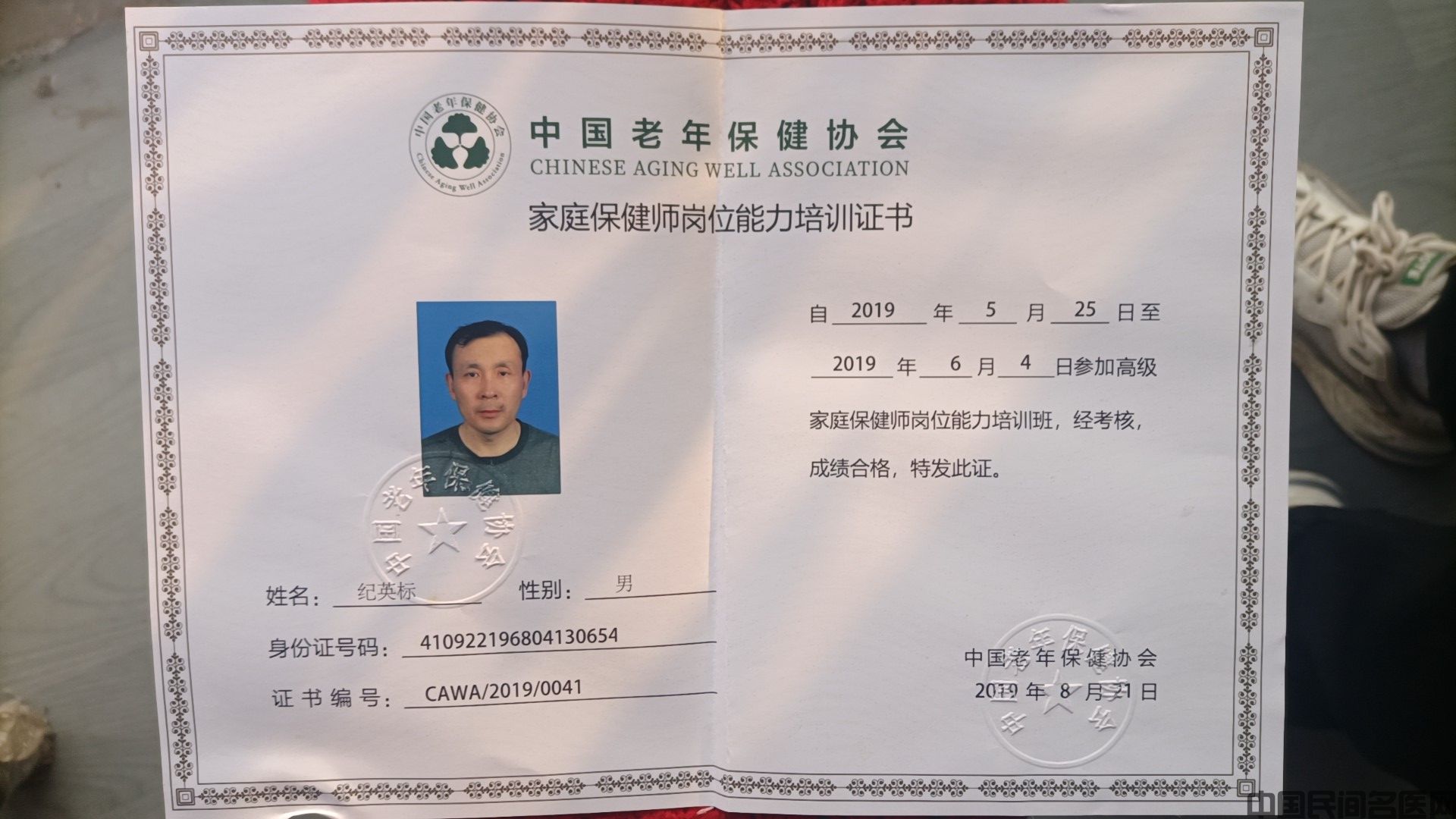 证书呈现:中国老年保健协会版发的:家庭保健师岗位能力培训证书