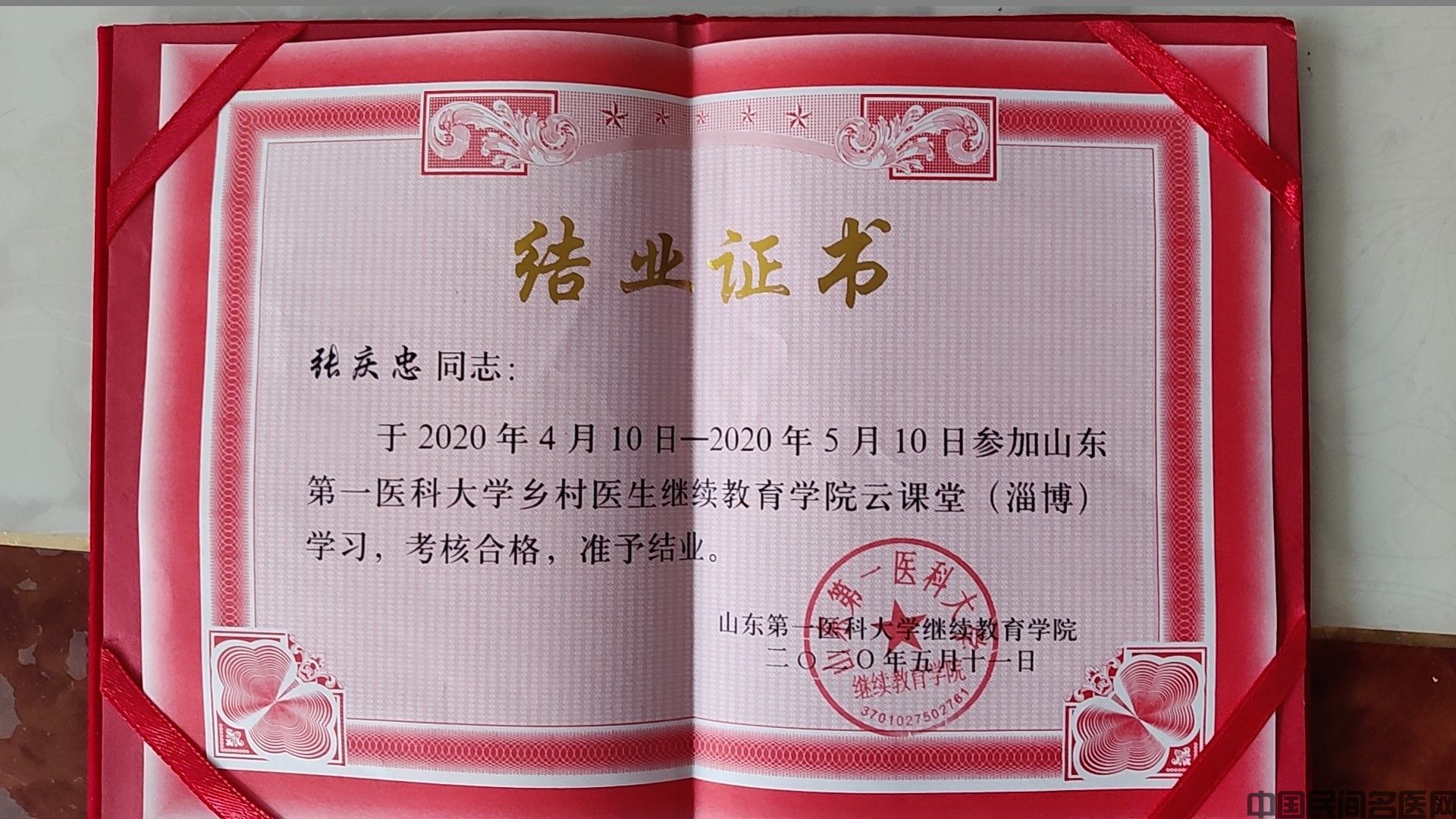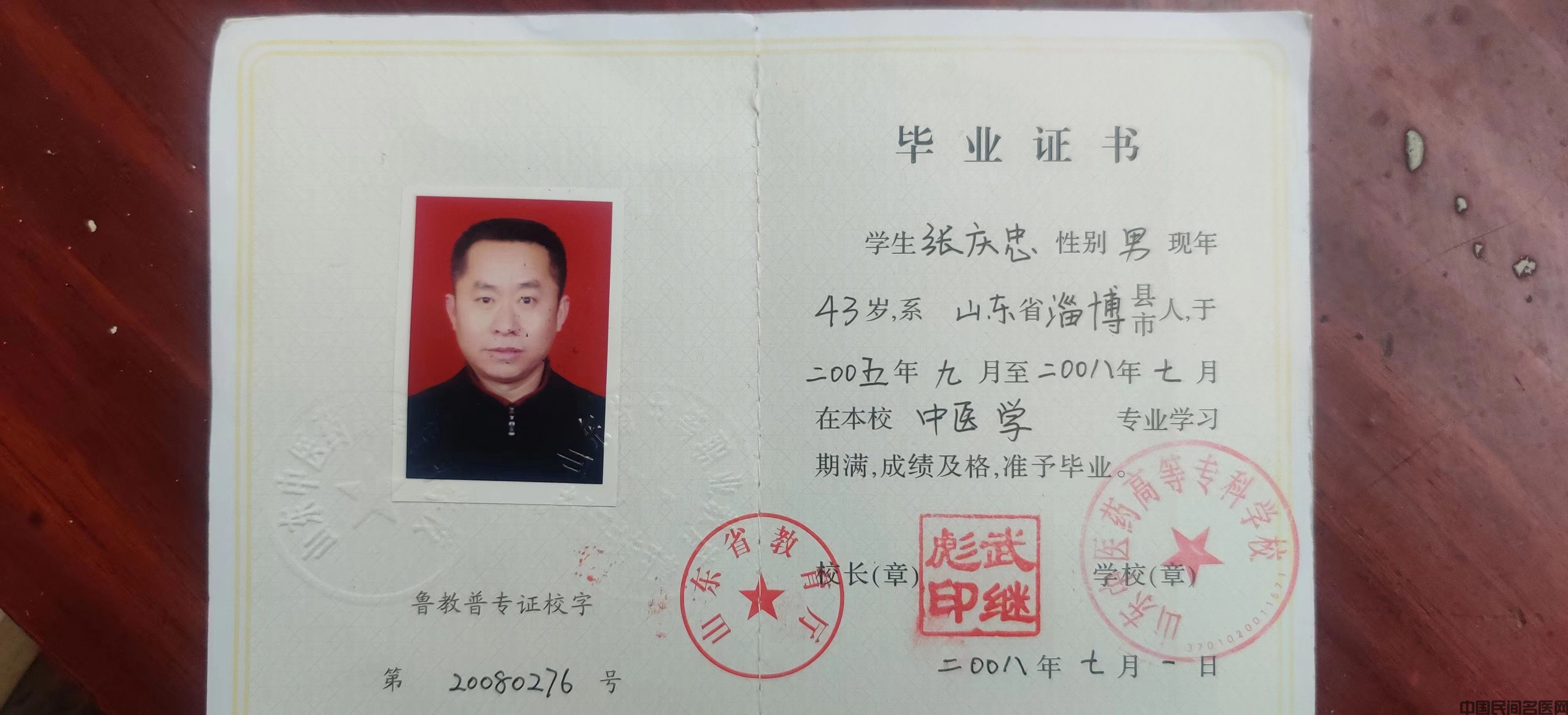 工作及学习简历:张庆忠,1965年1月17日出生,乡村医师。父亲张常德五十年代学习矿山救护,中医针灸,正骨等~当时在当地就小有名气,治好了很多疑难杂症,为患者解除了痛苦。本人张庆忠1994年开始跟诊随父行医,96年和父亲一起纳入乡镇卫生院一体化管理,继续从事中医针灸中药调理疾病的门诊接诊工作。1973年~1981年在马庄联中初中毕业,95年在济南考取了针灸师证书~2005~2007年山东中医药高等专科学校学习毕业,获得毕业证书,之间在济南卫校接受临床培训,聆听专家授课学习六个月,2012年考取乡村医师证,2009年~2016年在淄川区医院,区中医院参加培训学习,2017年在山东力明职业学院接受中医培训,2018年在济南脉学研究会中医馆学习培训,现从事中医针灸推拿,中医中药治疗风湿痹痛,中风,不寐,鼻渊,遗尿,月经不调等内科,儿科,妇科杂症!特别是擅长治疗颈肩腰腿疼,有近三十年的临床经验,治疗患者近五万人次,取得了患者朋友的信任厚爱。全国各地均有来诊病号,1997年开始就开始建立了患者病历档案至今。