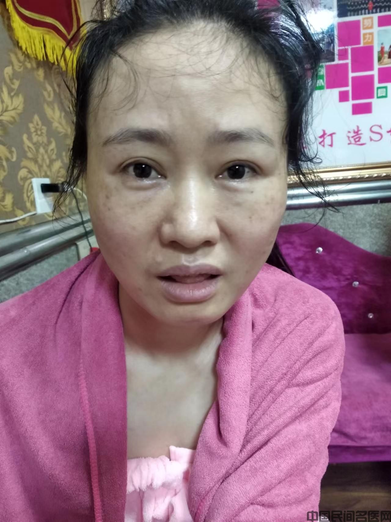 望诊:全身水肿不消,舌头肿胀严重(脾肿大1),舌尖平整(心脏病严重),舌左右两边肿胀变形( 肝肾功受损)。