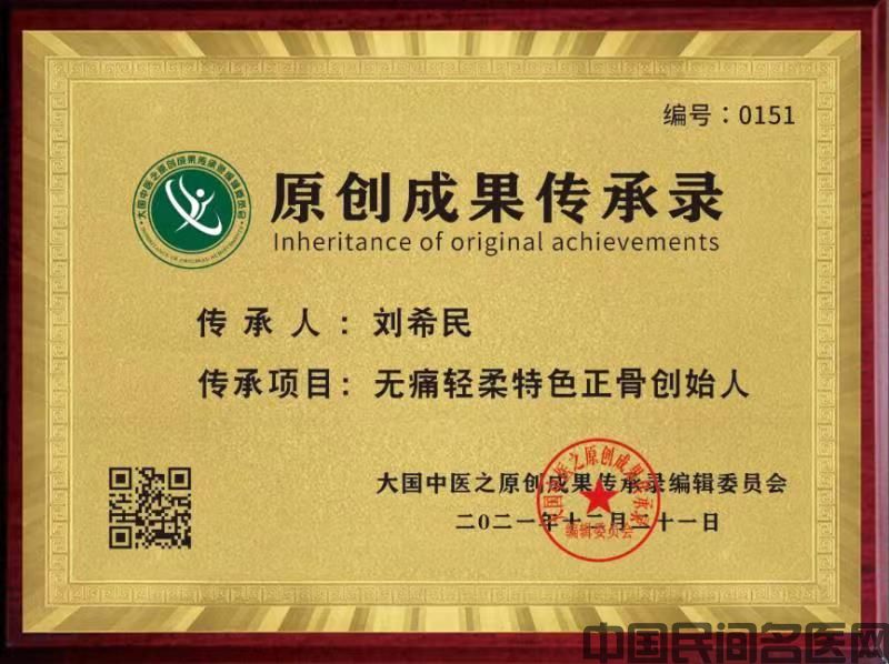 凭借独特的天分、慧根(灵性和悟性)、强大的遗传基因(医学天赋)加上多年的临床实践经验,在传统正骨手法的基础上又独创了无痛轻柔特色正骨手法,已被载入《大国中医之原创成果传承录》中(可以去百度、搜狐、腾讯这些大网站搜索刘希民) 。