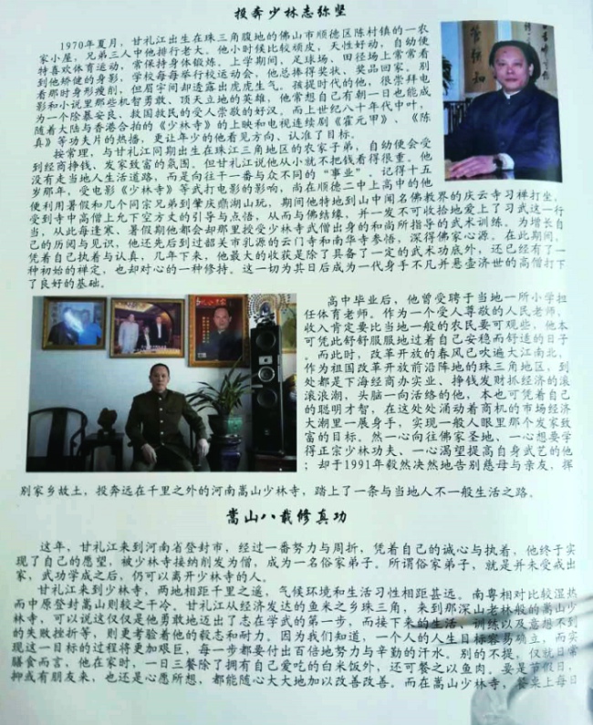 释金刚幼时聪颖智慧,悟性过人,尊崇武侠英杰。曾到山中文明佛教界的庆云寺习禅打坐,受到寺中高僧上允下空方丈的引导与点悟,从而与佛结缘。又先后到过韶关市乳源的云门寺和南华寺参悟,相继接受少林寺武曾出身的和尚指导武术训练,酷爱习武。20岁只身赴千里之外的河南嵩山少林寺,成为俗家弟子。8年修禅练功,历尽磨难,终成正果。他刀、抢、剑、棍、拳等各种少林功夫,样样精通。打出的各种套路,拳脚刚劲有力,使出的枪棍快速如风,那十分完美的攻防合一组套,一招一式中都迸发出少林武艺之威仪,一腾一跃之中无不尽显中华武道之雄健,特别是他那令人眼花的丈二流星锤,宛若行云流水,无隙可击,深得行家赏识。