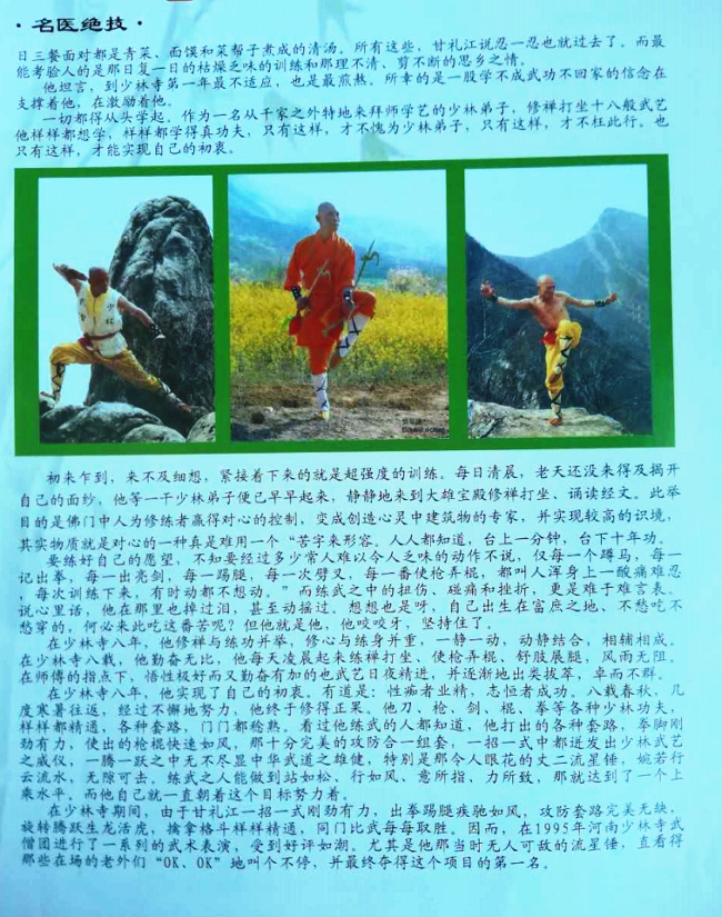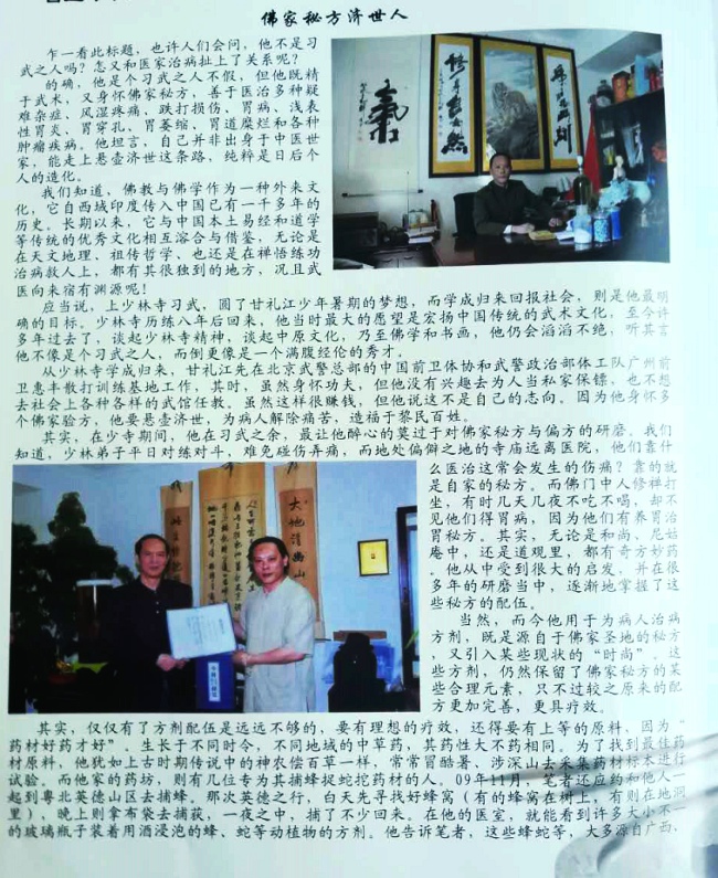 武、医历史以来素有渊源,金刚习武之余,醉心于佛家秘方、偏方的研习,方剂配伍熟记于心,加之天赋悟性,秉承传统,立异创新、勤研医技,立志做一个悬壶济世、普济众生的禅医。