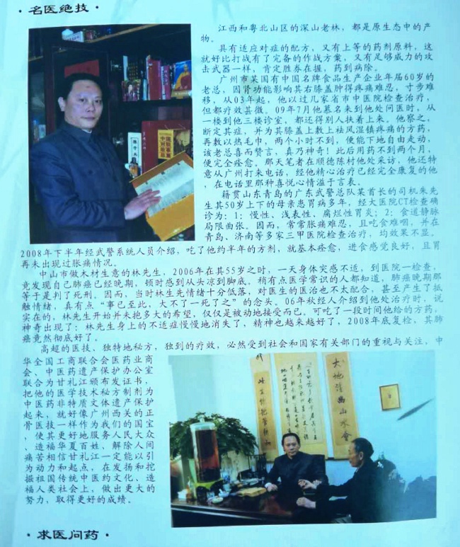 06年中山市林某55岁患晚期肺癌,省、市各大医院求治无效,耗资巨大,极度绝望,有幸遇金刚救治,(以佛家真传秘方、自采天然中草药调治),病情得到有效控制和逐渐好转。2008年底复查,其患肺癌奇迹般的消失,患者及亲属感激涕零,万般致谢,此事当地传为美谈。一代禅医以拯救万民疾患为己任,博览医书、废寝忘食、艰难求索;诊治疾患倍尽心力、精益求精。擅长对股骨头坏死、风湿关节痛、类风湿、痛风、跌打损伤、肠胃病、高血压、浅表性胃炎、胃穿孔、胃萎缩和各种肿瘤及消化系统等疾病的诊治。