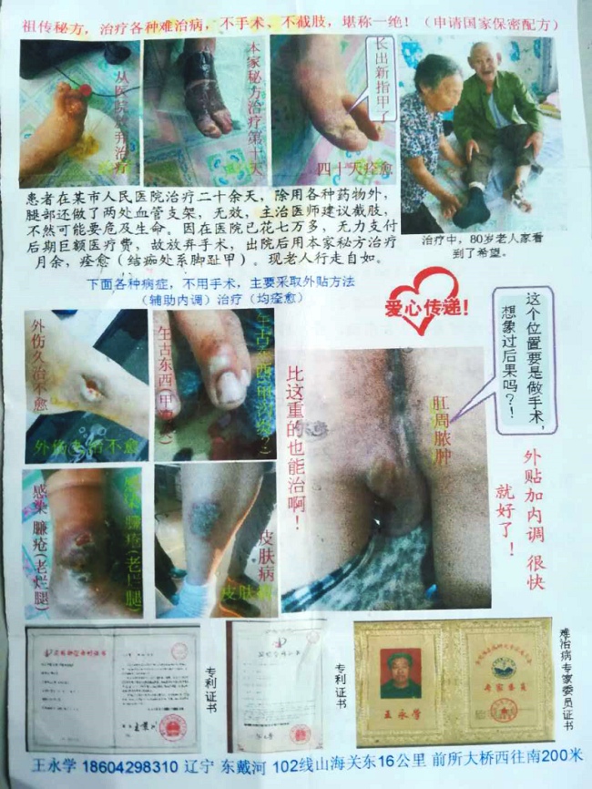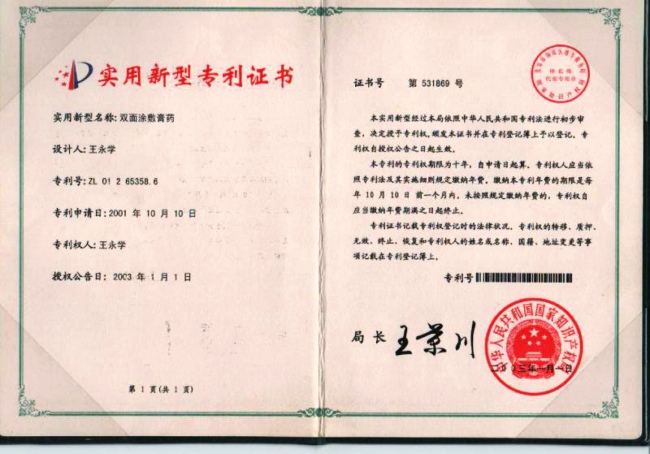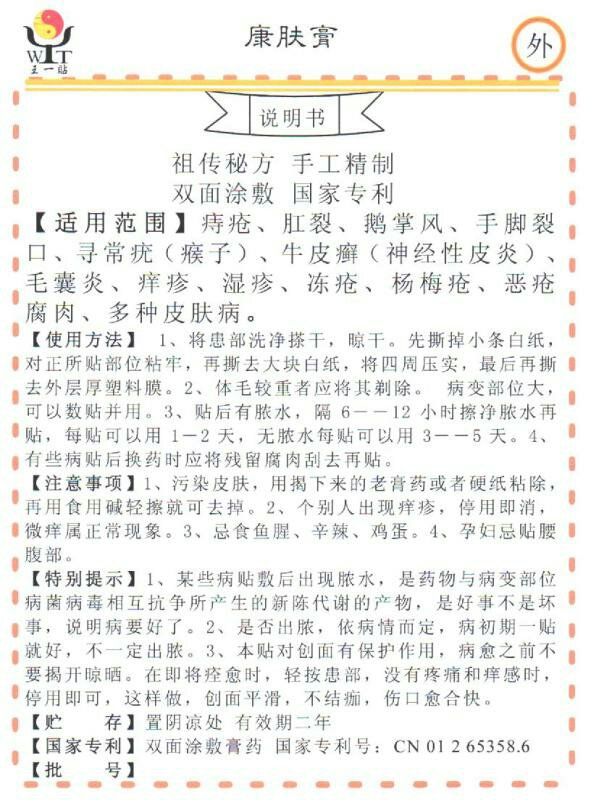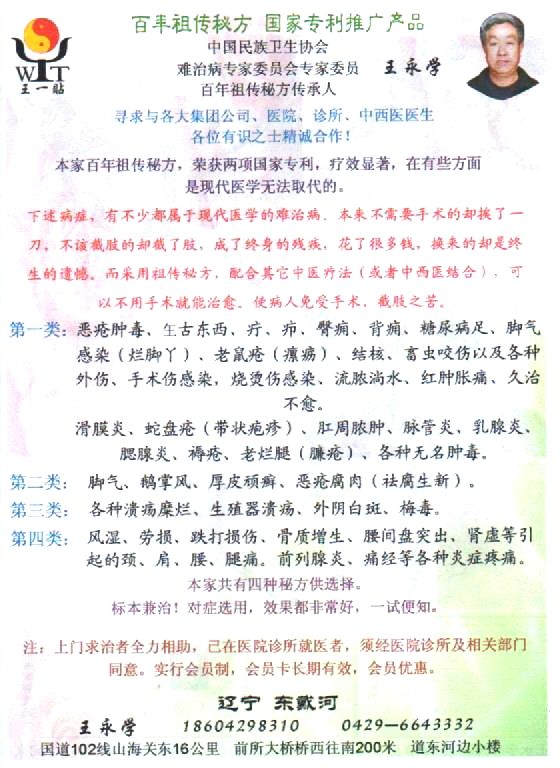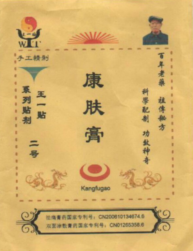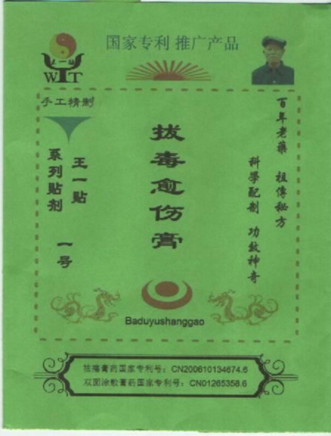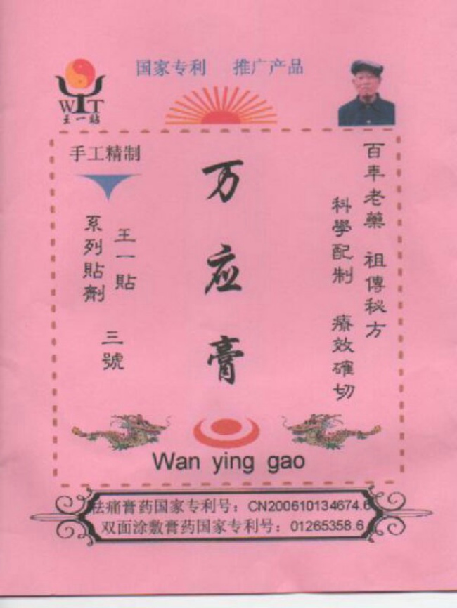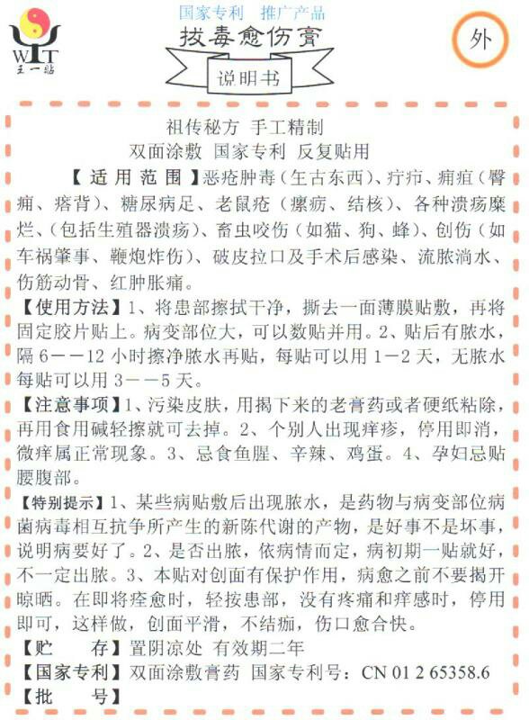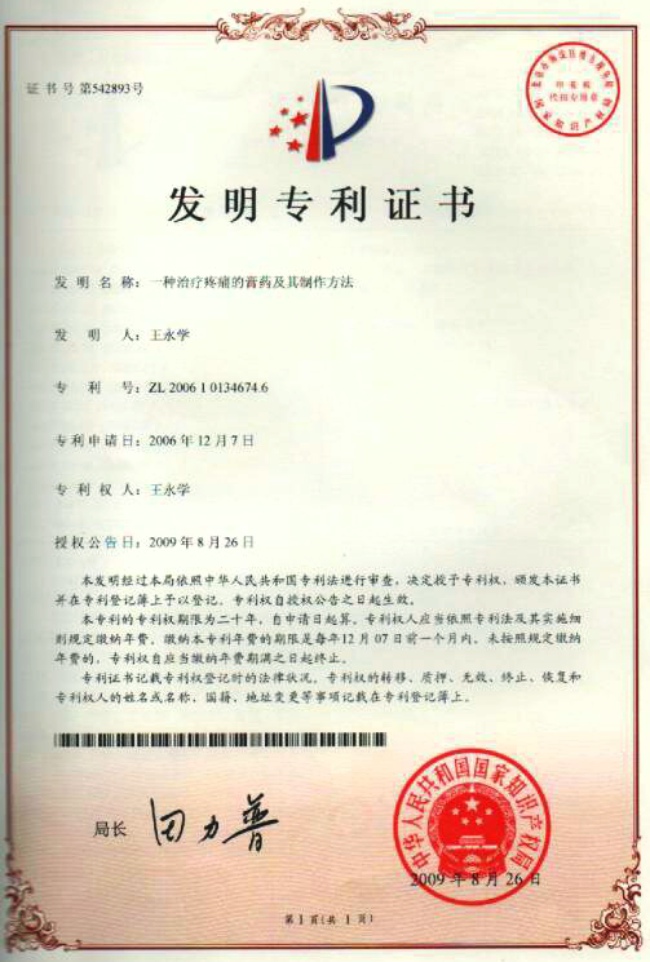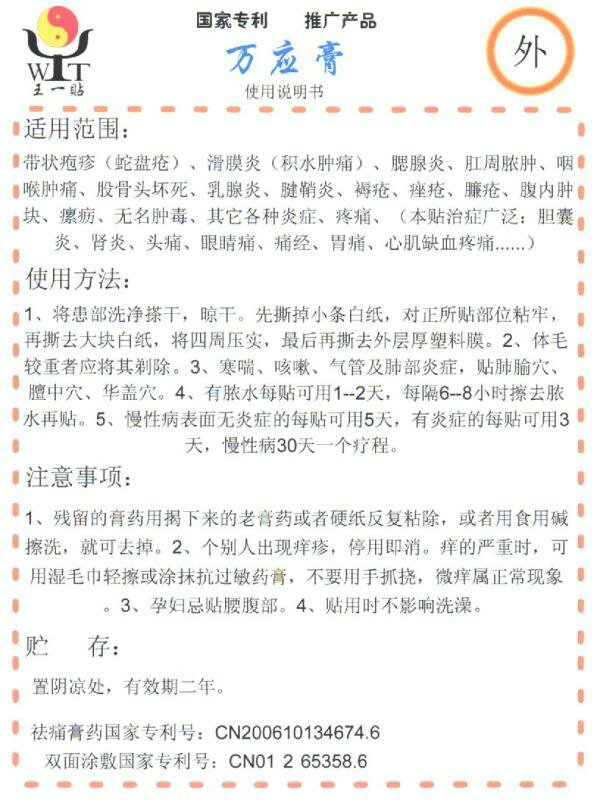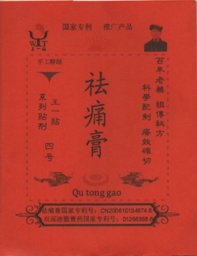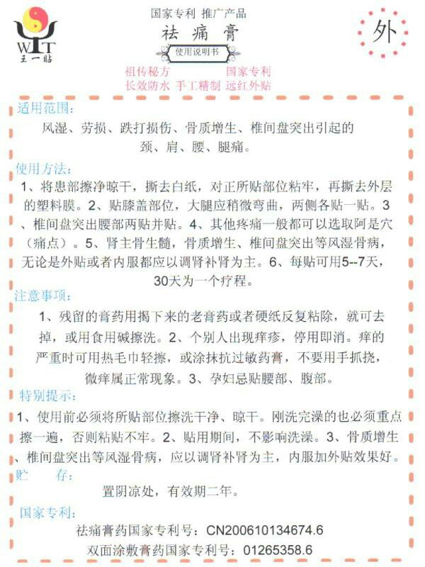 百年祖传,传统膏药,由数十味纯天然名贵药材,科学配制。制贴已荣获两国家专利,双面涂敷膏药,专利号:ZL 01 2 65358.6 一种治疗疼痛的膏药及其制作方法,专利号:ZL 2006 1 0134674.6 。药量大,药效长,每贴可用八--十天;反复贴用,不滑不脱;无毒副作用;显效迅速,最快十分钟;换药方便;治症广泛;标本兼治。