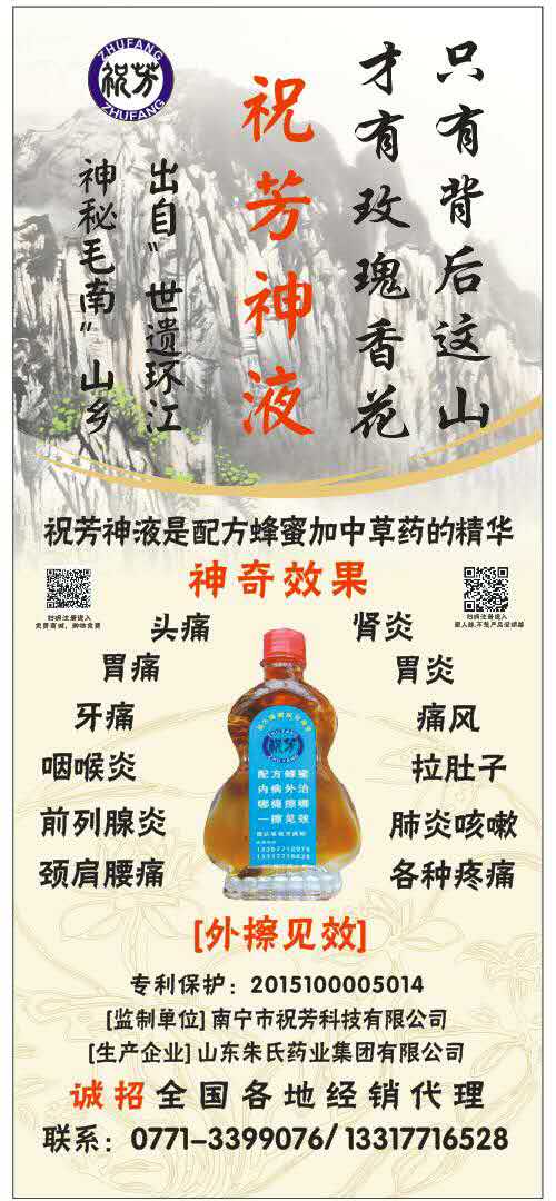 南宁市祝芳科技有限公司有着“世遗环江、神秘毛南”自家的祖传秘方和地方丰富的蜂蜜及中草药为基础,深入研究“内病外治”,用蜂蜜及中草药配制获得“配方蜂蜜”,外涂人体皮肤渗透到达体内炎症病痛部位。治疗各种病痛的“配方蜂蜜”遍布各地后,将取代“吃药打针”而颠覆现代医疗方法!